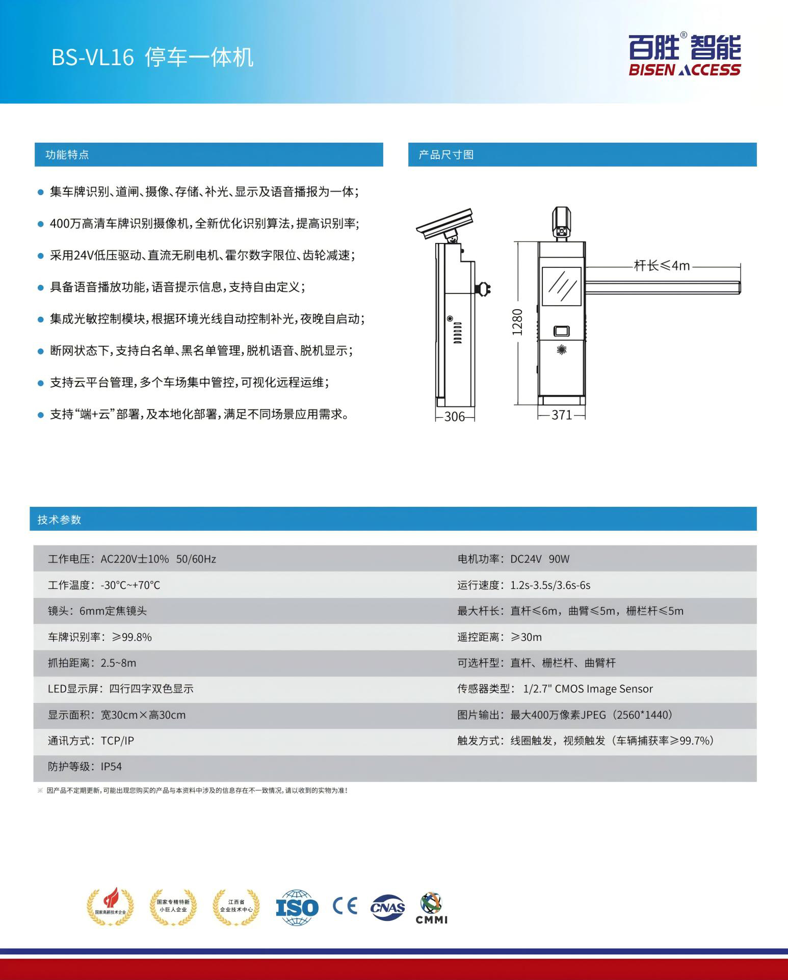 ●集車牌識(shí)別、道閘、攝像、存儲(chǔ)、補(bǔ)光、顯示及語音播報(bào)為一體;