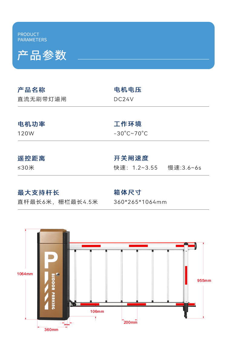 起落速度:直桿道閘:1.2~1.5s 3米直桿;直桿道閘:5~6s 6米直桿;伸縮桿道閘:5~6s 6米伸縮桿;柵欄道閘:3s~6s 3-4.5米柵欄桿